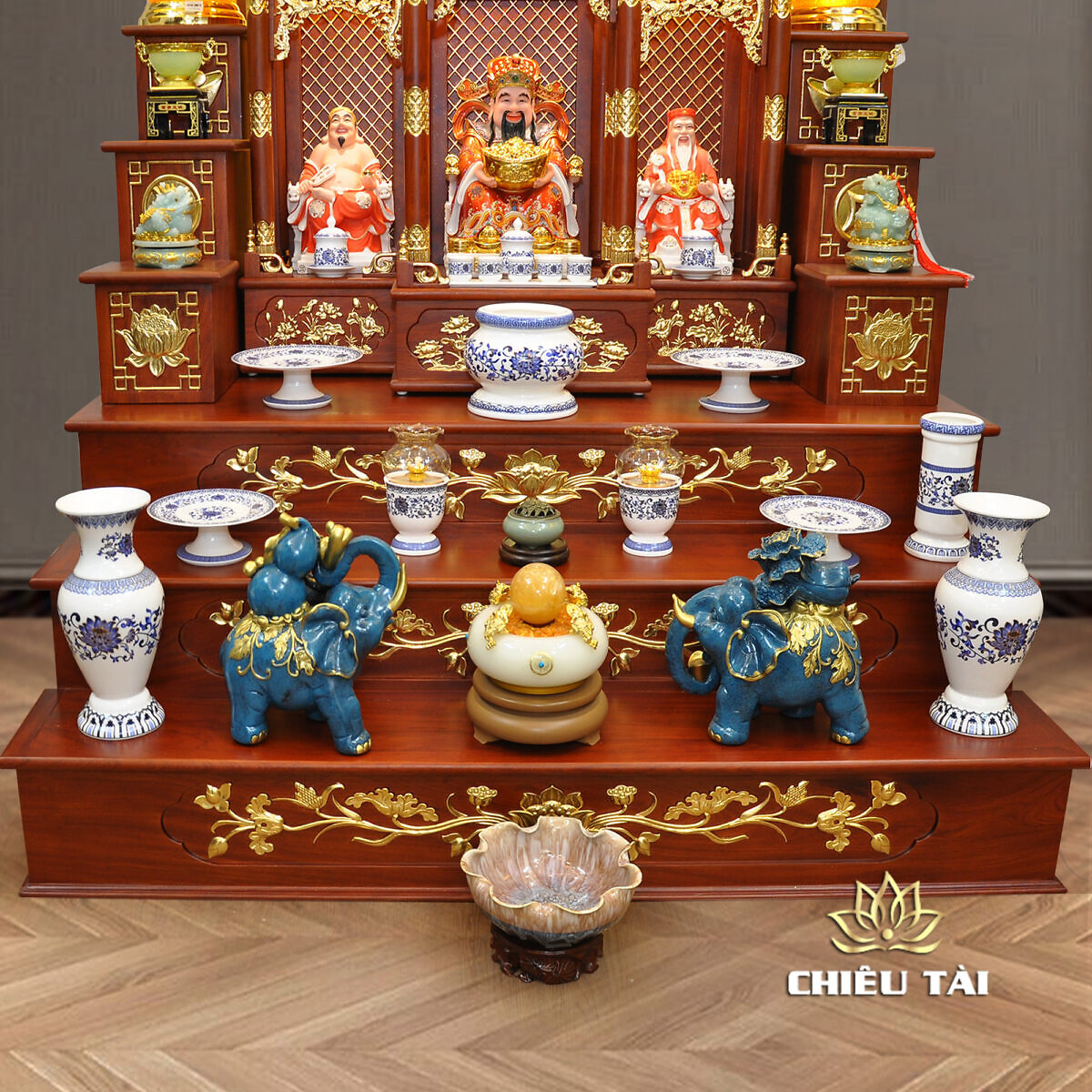 Bộ Bàn Thờ Thần Tài Thổ Địa Ba Gian Sứ Trắng Sen Xanh “Thái Hòa Hưng Vượng”, KT 153*127*189cm