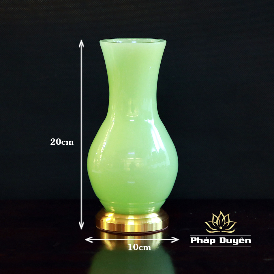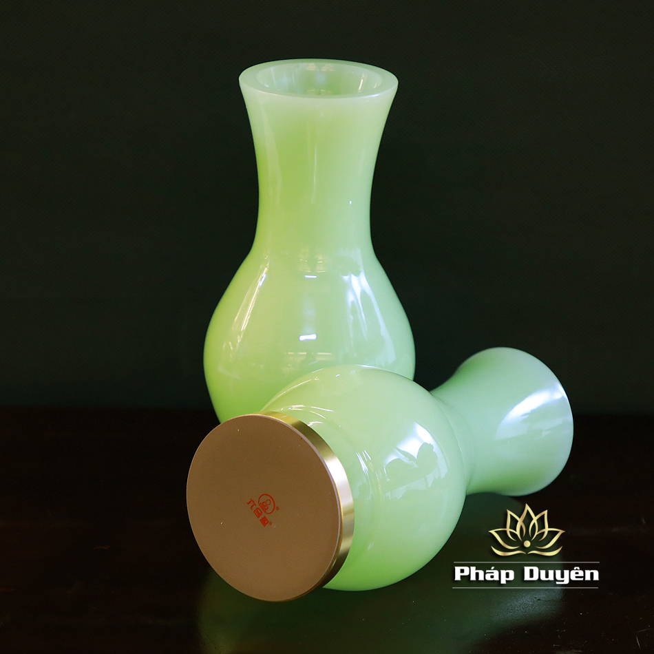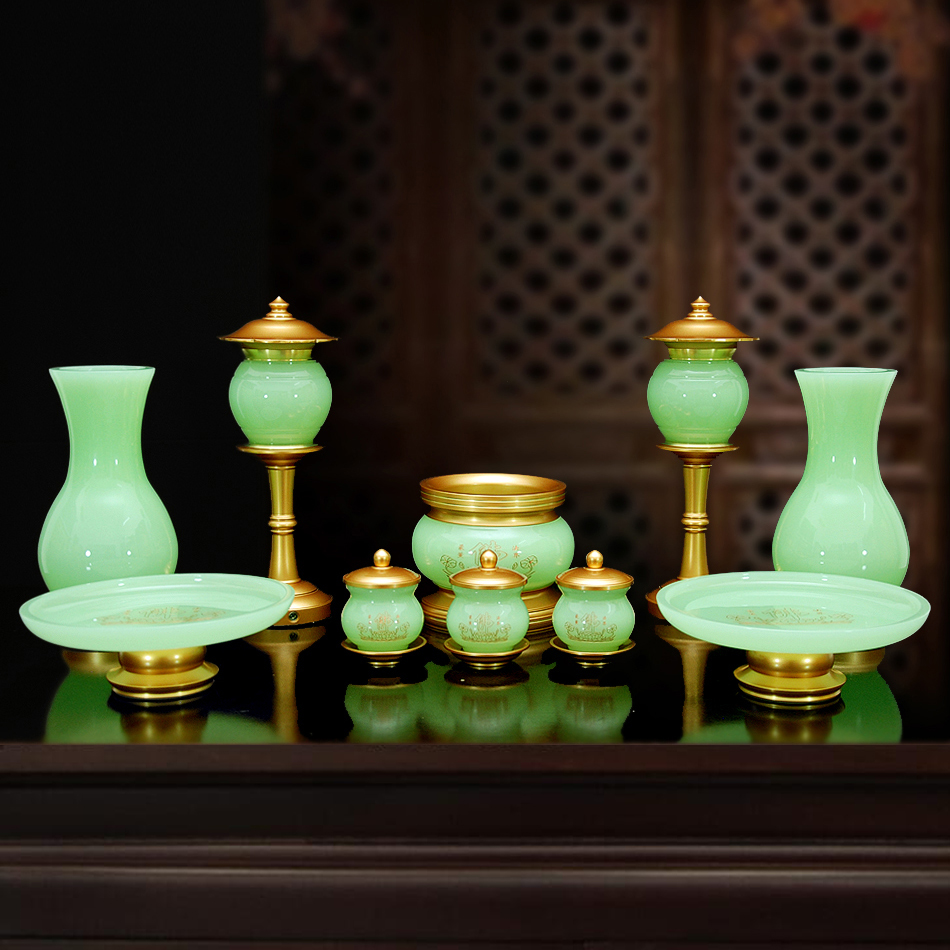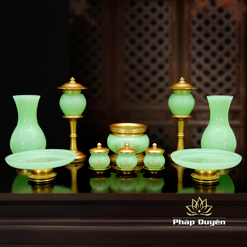 Chất liệu cao cấp: Bộ đồ thờ được chế tác từ lưu ly xanh ngọc bọc đồng, tạo cảm giác thanh tịnh và trang nghiêm.