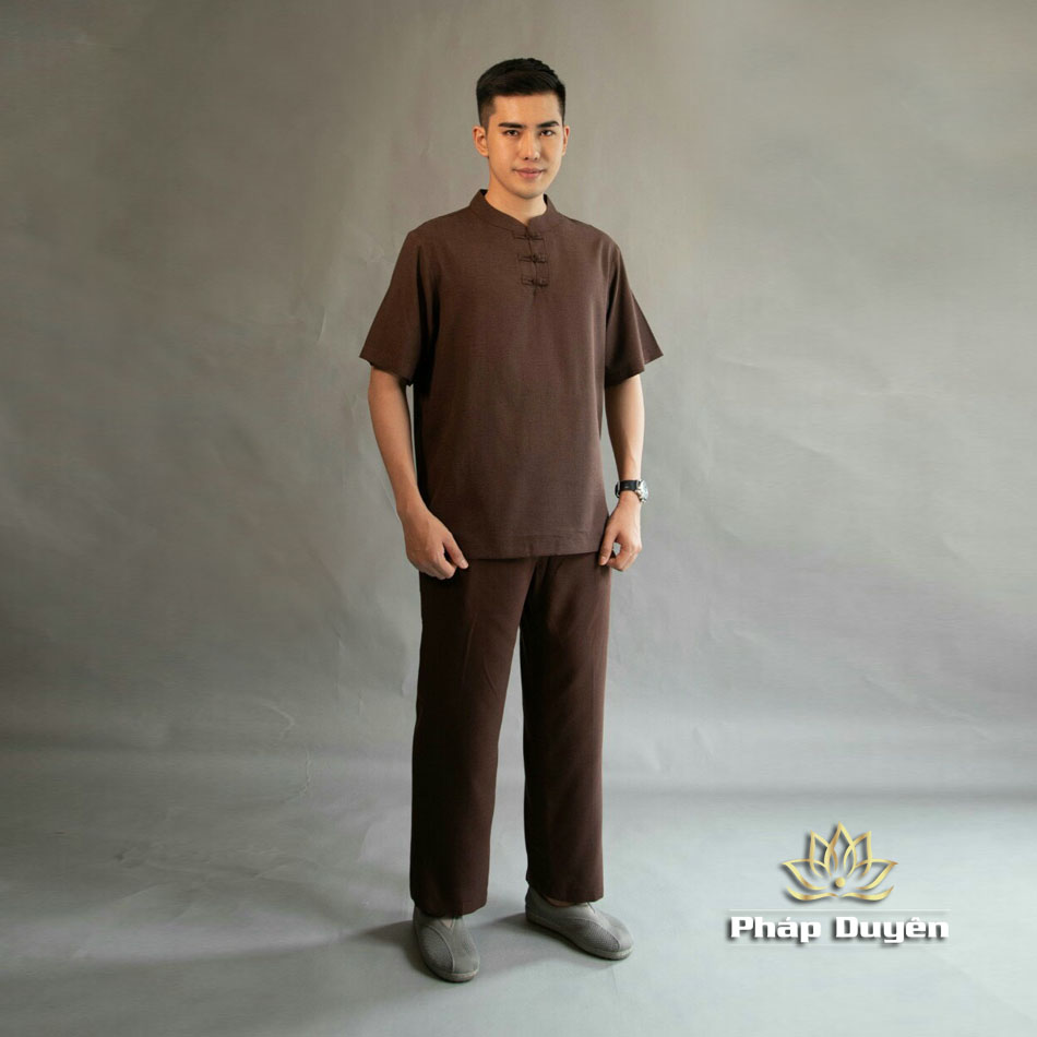 Bộ Cư Sĩ Nam Cổ Trụ Tay Ngắn Vải Linen, Màu Nâu Đen, Nhiều Size