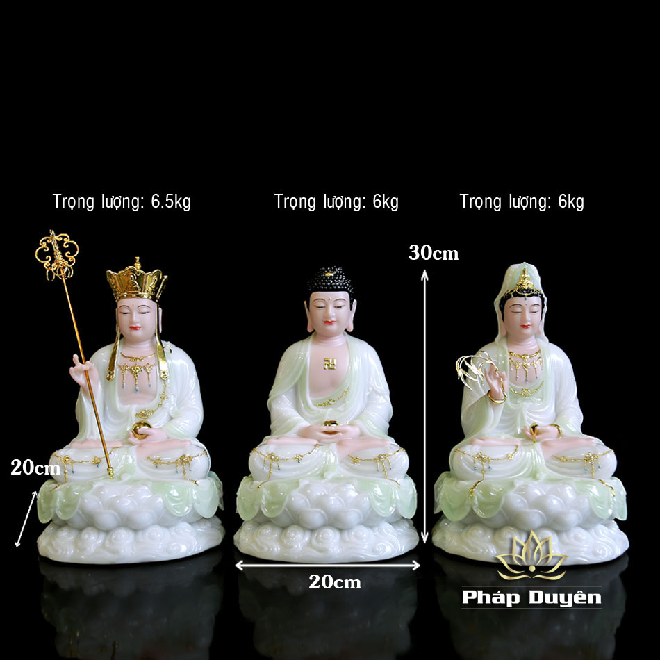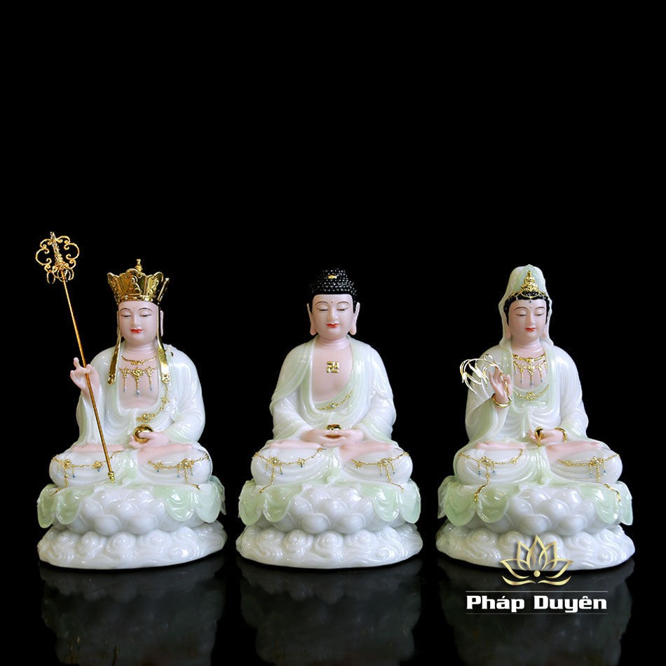 Bộ Ta Bà Tam Thánh Ngồi Đài Sen Bằng Bột Đá Màu Thanh Thiên, Cao 30cm