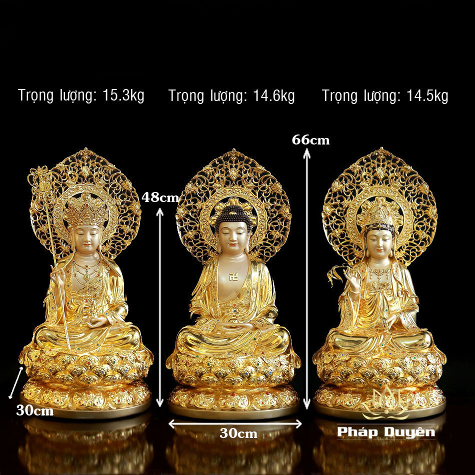 Bộ Ta Bà Tam Thánh Ngồi Đài Sen Dát Vàng Ấn Bảo, Cao 48cm (Tổng Lá Đề 66cm), Cao 66cm (Tổng Lá Đề 80cm)