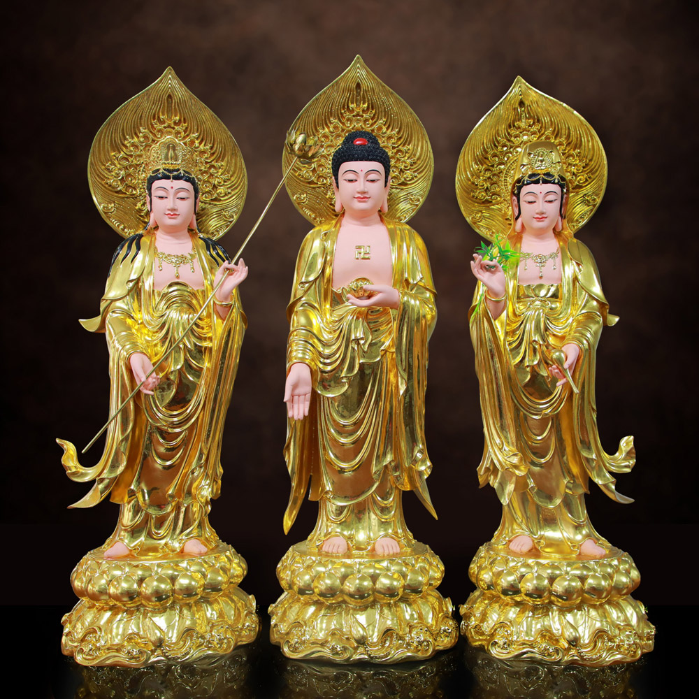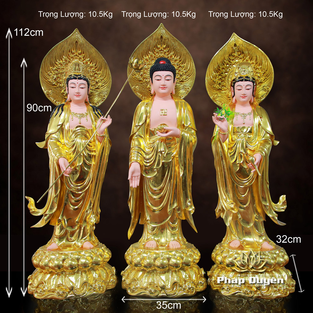 Bộ Tây Phương Tam Thánh Đứng, Chất Liệu Composit Dát Vàng, Cao 90cm (Tổng Lá Đề Cao 112cm)