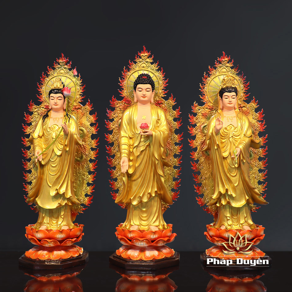 Bộ Tượng Tây Phương Tam Thánh Đứng Đài Sen Đế Bát Giác, Có Hào Quang, Chất Liệu Composite, Cao 80cm
