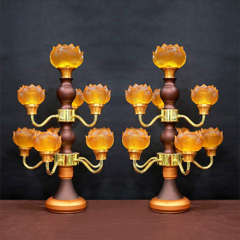 Đôi Đèn Hoa Sen Thủy Lưu Ly Thân Nâu Cổ, 9 Bông, Cao 48cm