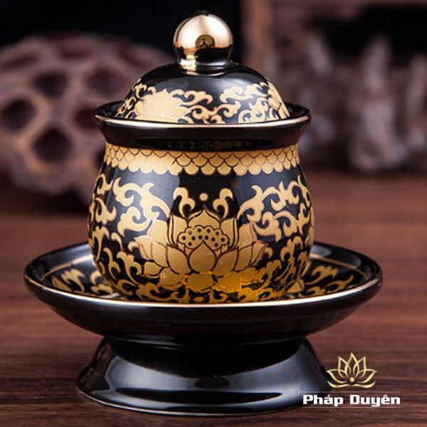 Ly Nước Thờ Gốm Màu Đen Hoa Sen Vàng, Nhiều Kích Cỡ