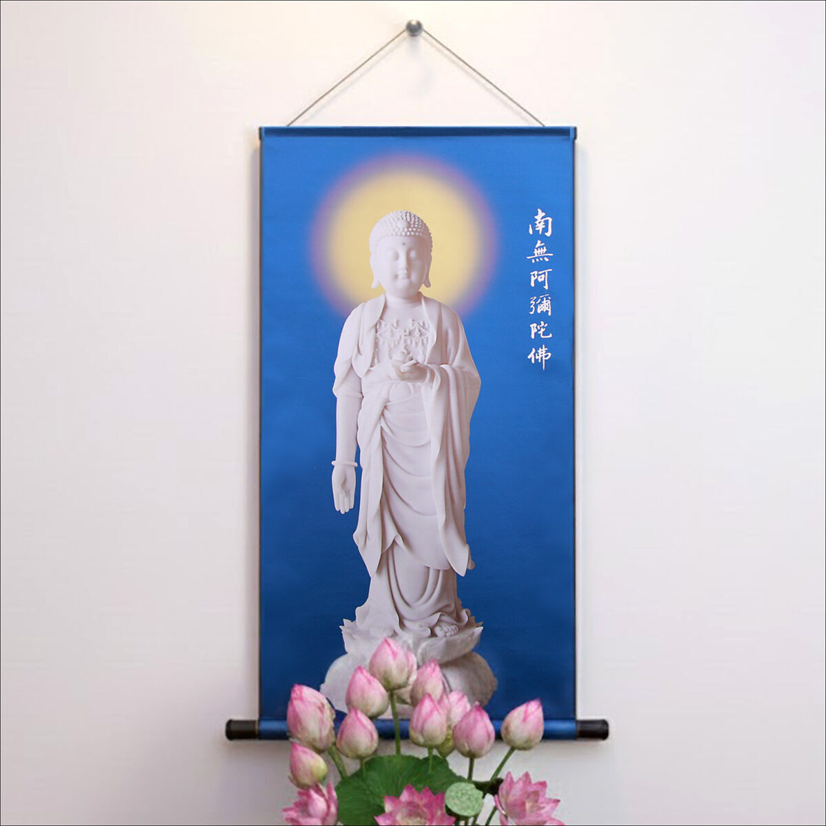 Tranh Phật A Di Đà Thân Trắng Nền Xanh, Bằng Lụa Có Trục Gỗ, 45x90cm