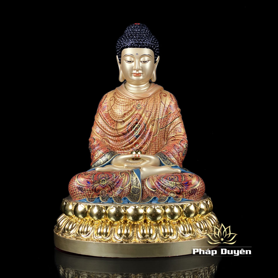 Tượng Bổn Sư Thích Ca Áo Đỏ Ngồi Đài Sen Bằng Đồng Vẽ Gấm, Cao 48cm