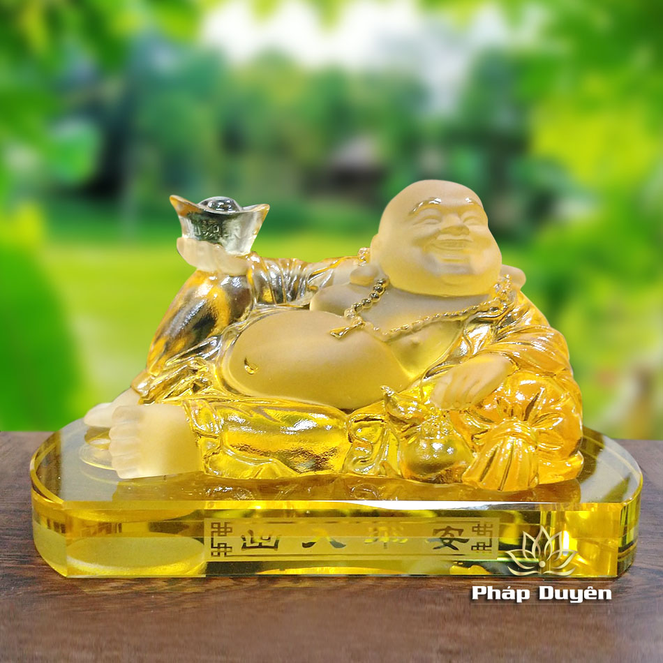 Tượng Để Xe Bồ Tát Di Lặc Bằng Lưu Ly Mầu Vàng, Kích Thước 8x13.5cm
