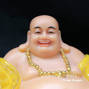 Tượng Di Lặc ngồi cười, tay phải đặt trên túi bao bố, tay trái cầm chuỗi vòng