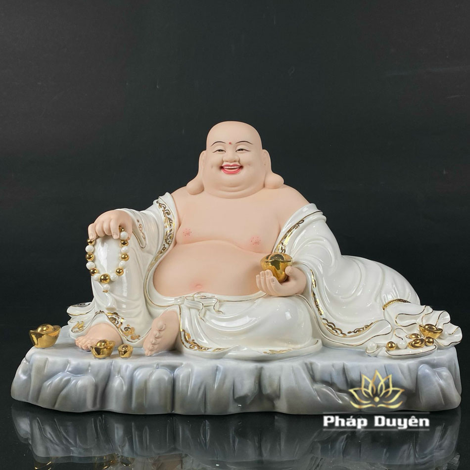 Tượng Di Lặc Nằm Ngồi, Bằng Sứ, Màu Trắng, Kích Thước 40cm, 48cm