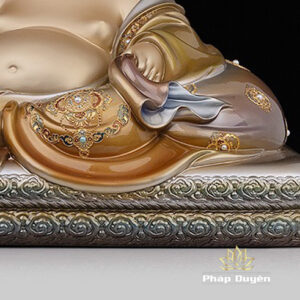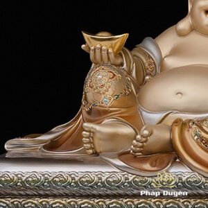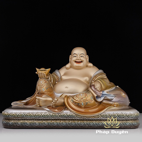 Tượng Di Lặc Ngồi Nằm Cầm Nén Vàng Bằng Đồng Cổ Kim, Kích Thước 24cm