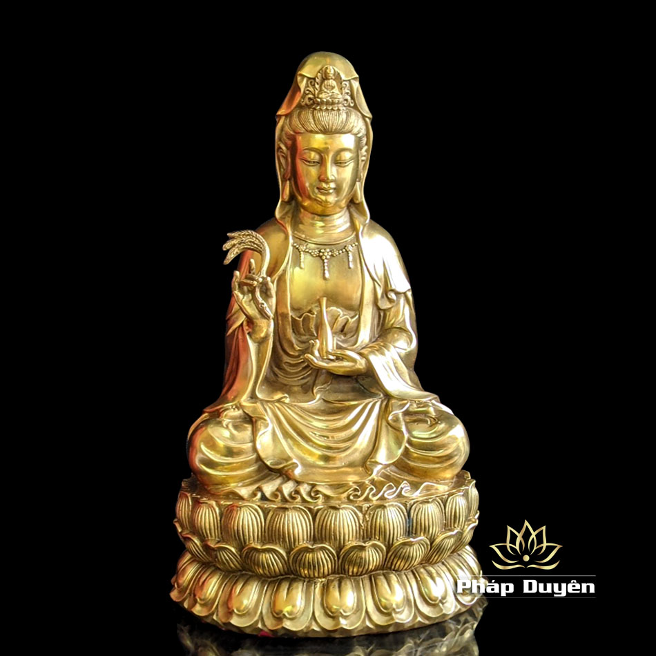 Đức Quán Thế Âm ngồi kiết già trên đài sen, tay trái cầm bình nước cam lồ, tay phải cầm lá liễu