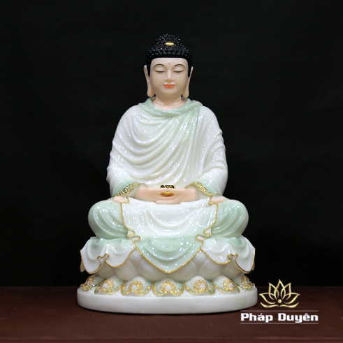 Tượng Phật Thích Ca Ngồi Đài Sen Viền Vàng Bằng Bột Đá Cẩm Thạch Mầu Thiên Thanh, Cao 48cm