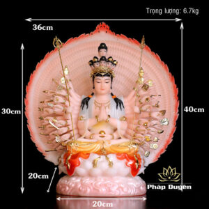 Tượng Quan Âm Thiên Thủ Thiên Nhãn Ngồi Đài Sen Đế Mây Bằng Bột Đá Vẽ Hoa, Cao 30cm (Tổng Cao 40cm)