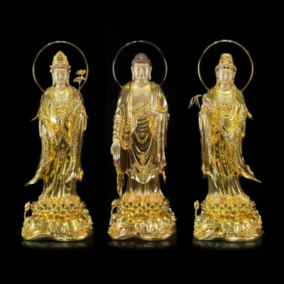 Bộ Tượng Tây Phương Tam Thánh Bằng Đồng Dát Vàng Cao 90cm (Tổng Lá Đề 1m)