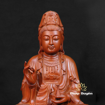 Tượng Phật Quán Thế Âm Ngồi Gỗ Gõ Vàng (Sơn Nâu Đỏ), Cao 50cm